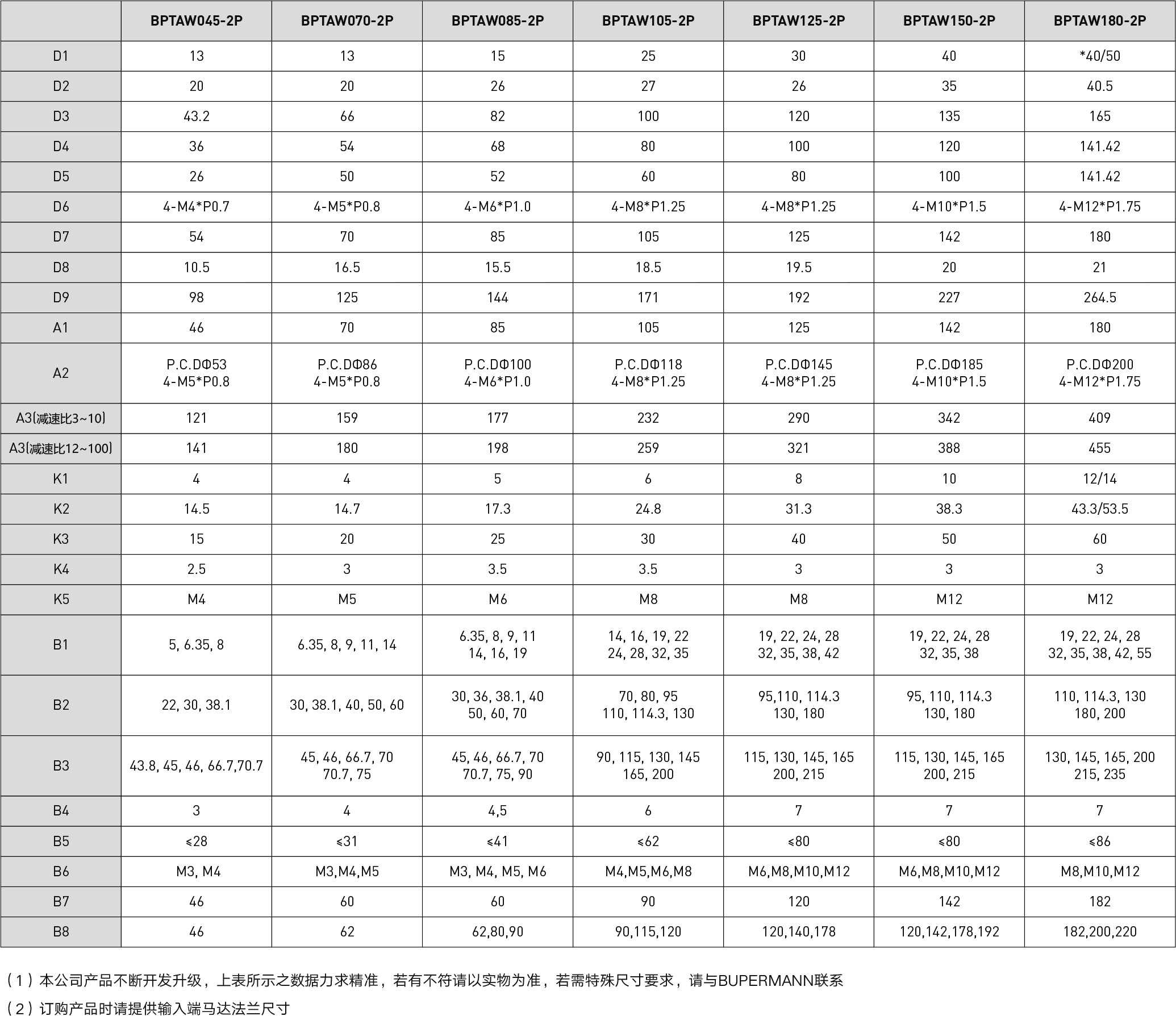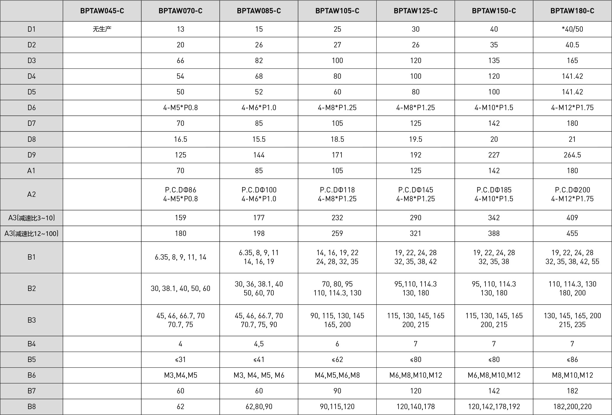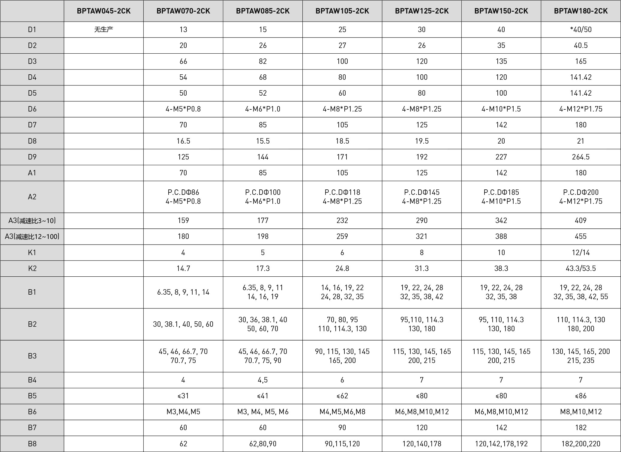 | 技術(shù)參數(shù) | 段數(shù) | 減速比 | BPTAW045 | BPTAW070 | BPTAW085 | BPTAW105 | BPTAW125 | BPTAW150 | BPTAW180 |